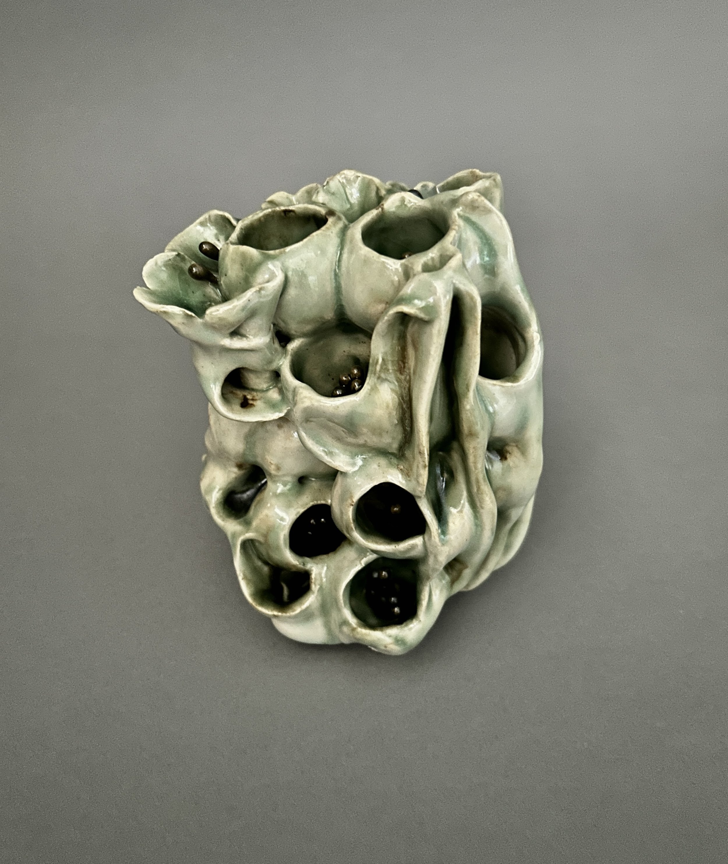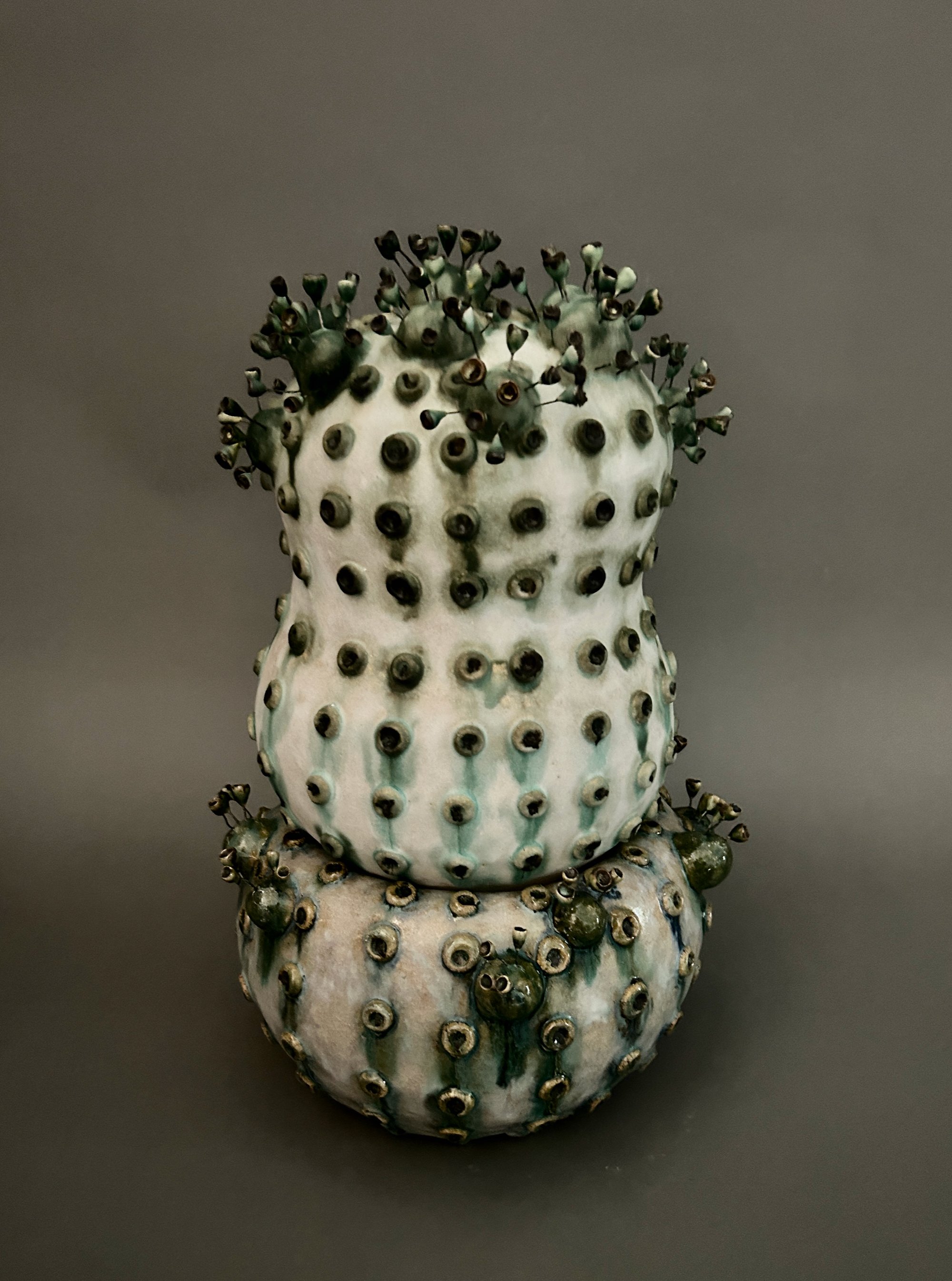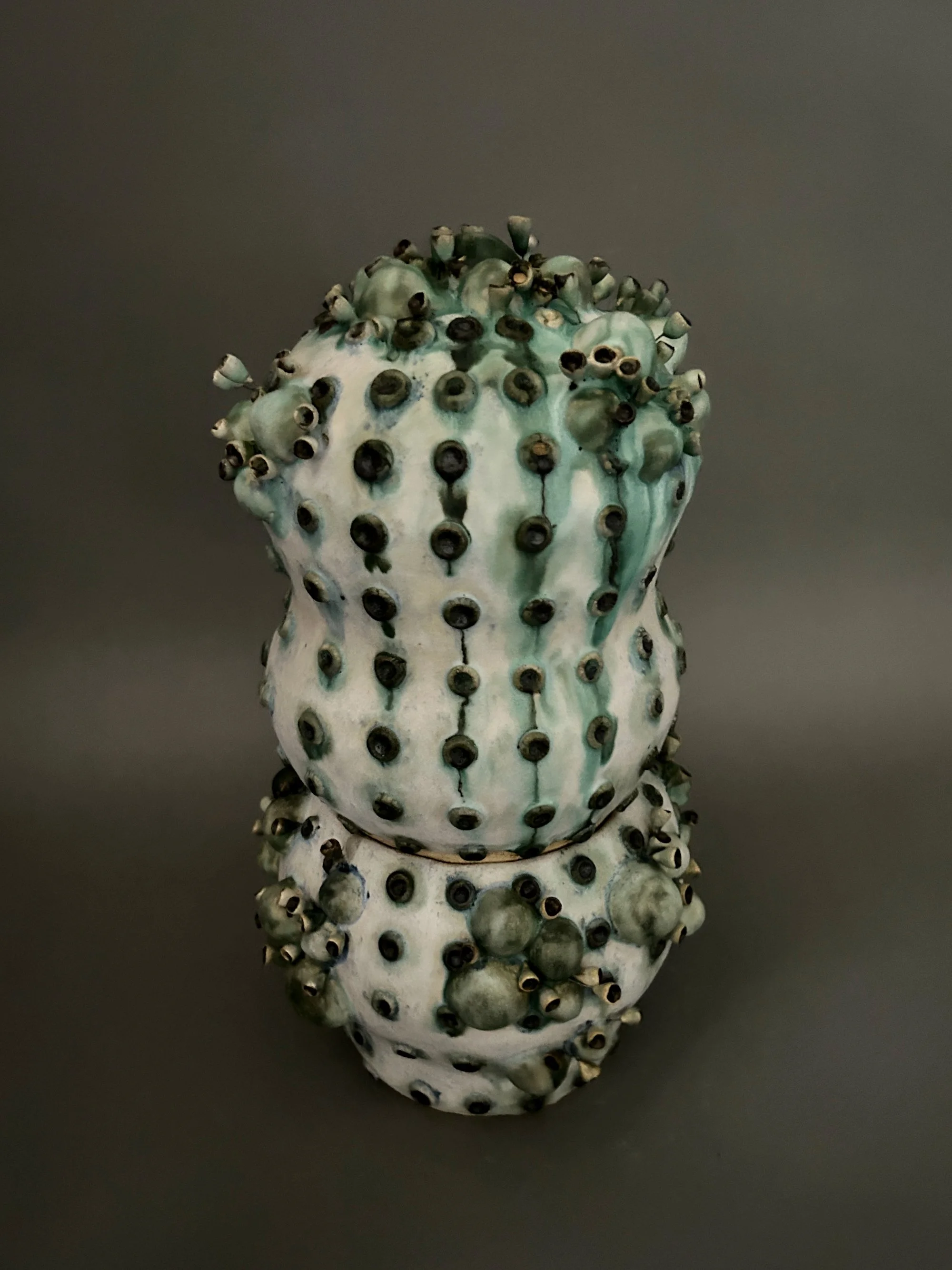 This body of work reflects my ongoing drive to experiment with technique and process. I am always seeking ways to challenge my own skills—working beyond what I already know in order to discover new methods that allow me to express my enduring relationship with the natural world. With these pieces, I was guided by the material. By adapting my methods and embracing unfamiliar approaches, I allowed new possibilities to emerge—sometimes unexpectedly, though always resulting in a form rooted in the natural world. The Seed Pod / Larva series grew out of a process that invited chance and surprise. The forms revealed themselves in the process of making, and I began to recognize their echoes of seed pods and larvae. In Bloom, I expanded on these same techniques, taking what I had learned from the Seed Pods into a the next phase of development, layering and extending forms that suggest emergence and unfolding life. The Re-wilding pieces were born from experiments with an extruder. When I combined structural elements with clustered, nest-like forms, the sculptures began to recall wild bee hives—like those that cling to the upper walls of the old courthouse in downtown Reno. With the Globulous works, I set out to refine my approach to multi-part, stacked compositions. The resulting pieces suggest organic accumulations, resembling segmented plant growth. Across all of these explorations, the natural world remains both the source and the touchstone of my practice. Its forms and life-processes continue to influence my work. In a time when the environment feels increasingly vulnerable, it seems all the more vital to notice, and draw value from the living systems that sustain us.