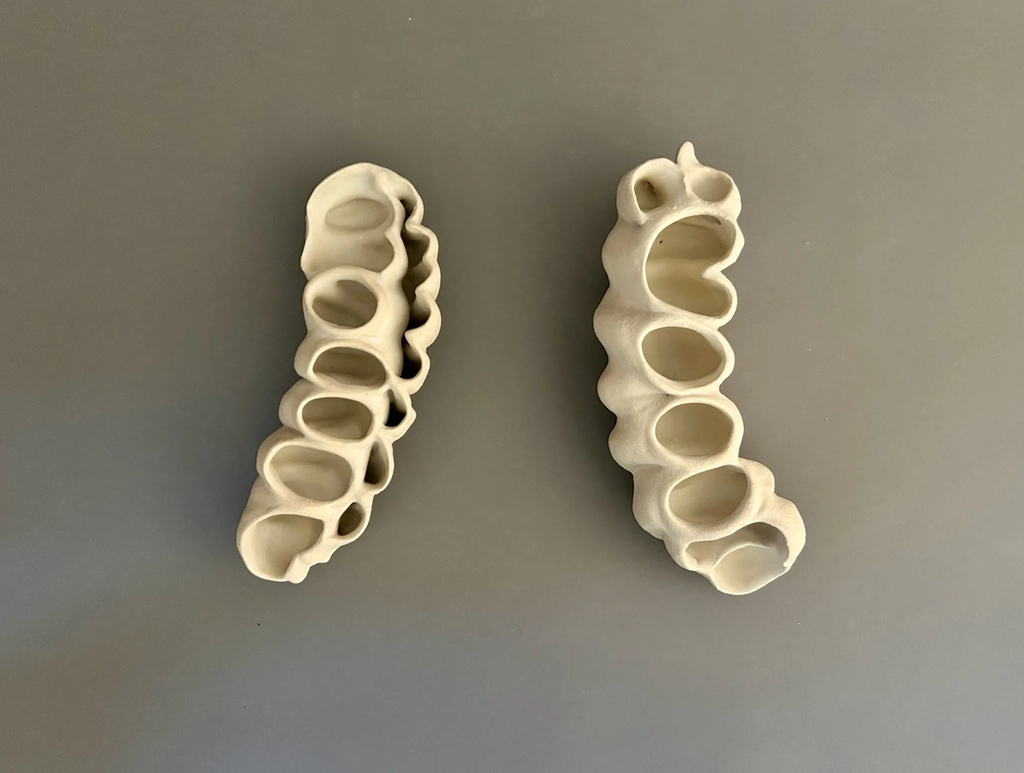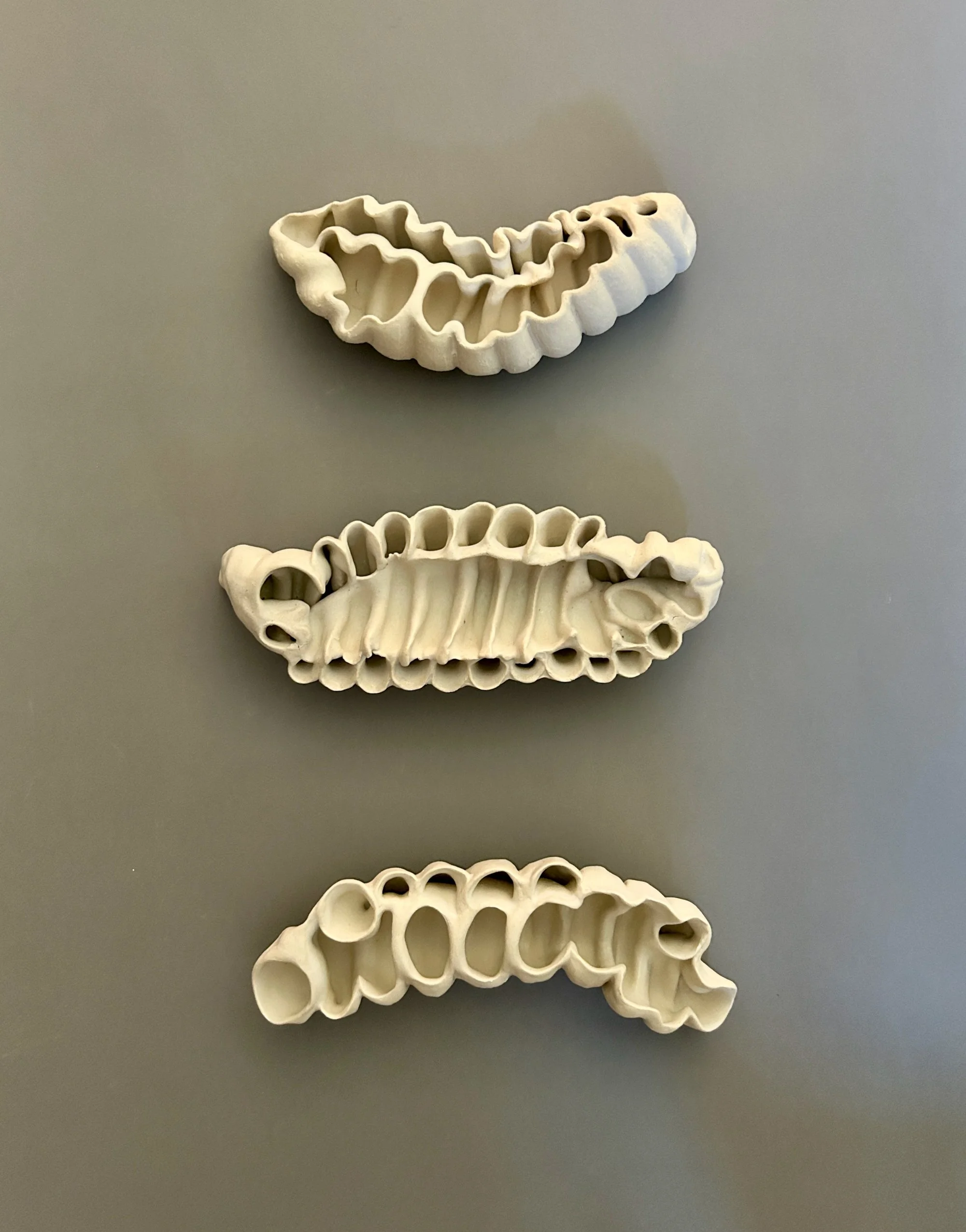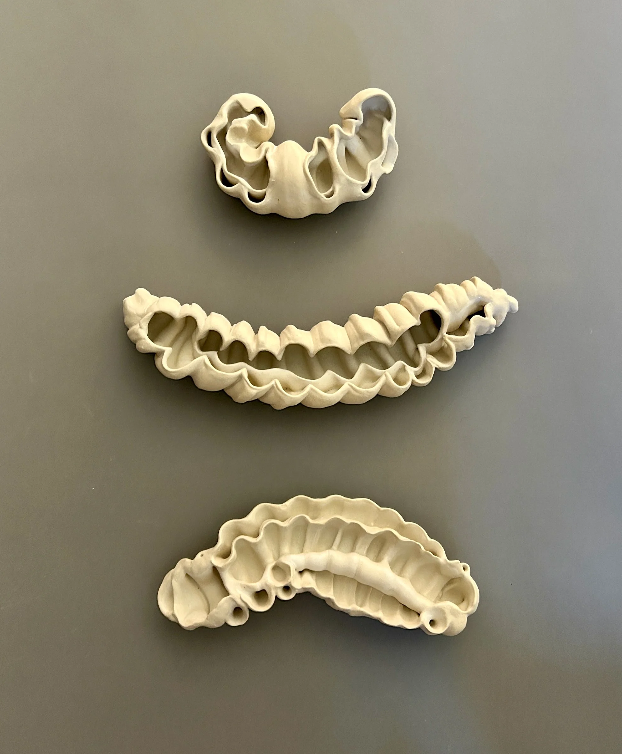 This body of work reflects my ongoing drive to experiment with technique and process. I am always seeking ways to challenge my own skills—working beyond what I already know in order to discover new methods that allow me to express my enduring relationship with the natural world. With these pieces, I was guided by the material. By adapting my methods and embracing unfamiliar approaches, I allowed new possibilities to emerge—sometimes unexpectedly, though always resulting in a form rooted in the natural world. The Seed Pod / Larva series grew out of a process that invited chance and surprise. The forms revealed themselves in the process of making, and I began to recognize their echoes of seed pods and larvae. In Bloom, I expanded on these same techniques, taking what I had learned from the Seed Pods into a the next phase of development, layering and extending forms that suggest emergence and unfolding life. The Re-wilding pieces were born from experiments with an extruder. When I combined structural elements with clustered, nest-like forms, the sculptures began to recall wild bee hives—like those that cling to the upper walls of the old courthouse in downtown Reno. With the Globulous works, I set out to refine my approach to multi-part, stacked compositions. The resulting pieces suggest organic accumulations, resembling segmented plant growth. Across all of these explorations, the natural world remains both the source and the touchstone of my practice. Its forms and life-processes continue to influence my work. In a time when the environment feels increasingly vulnerable, it seems all the more vital to notice, and draw value from the living systems that sustain us.